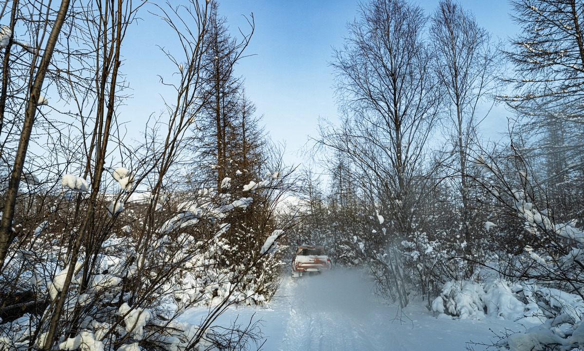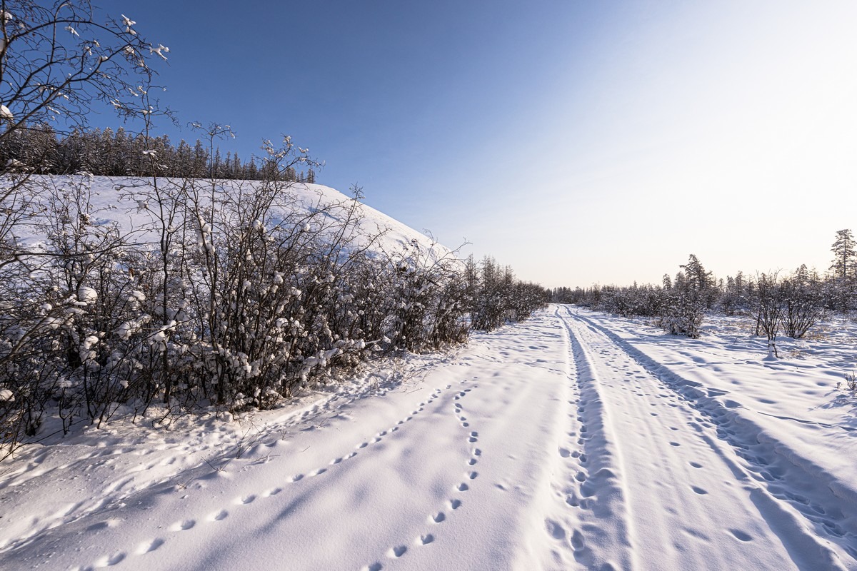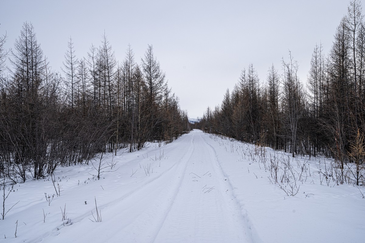 Кстати, если вы заметили, то на непроезжей части Старого колымского тракта всё же видны какие-то заметённые снегом следы проезжавшего ранее транспорта. Вот, например:
