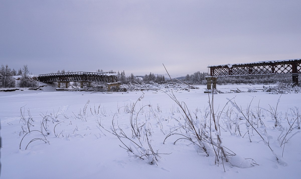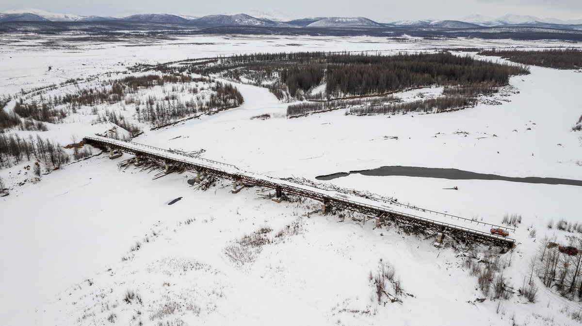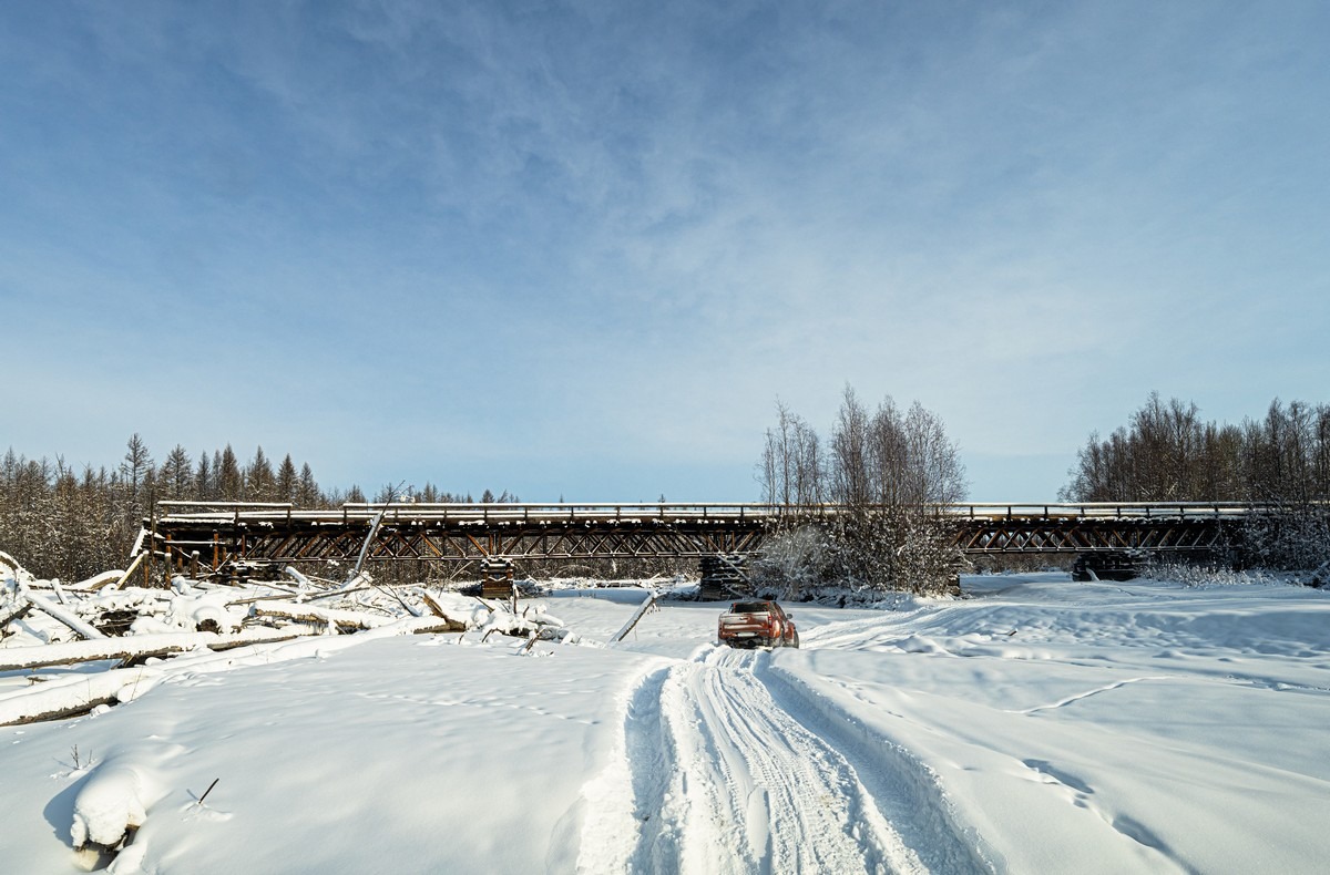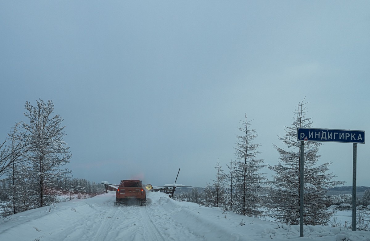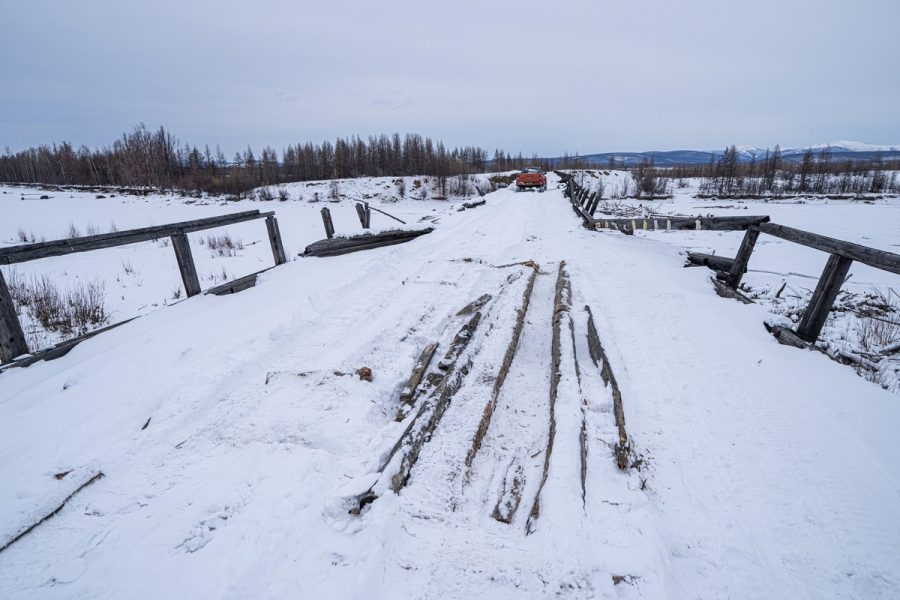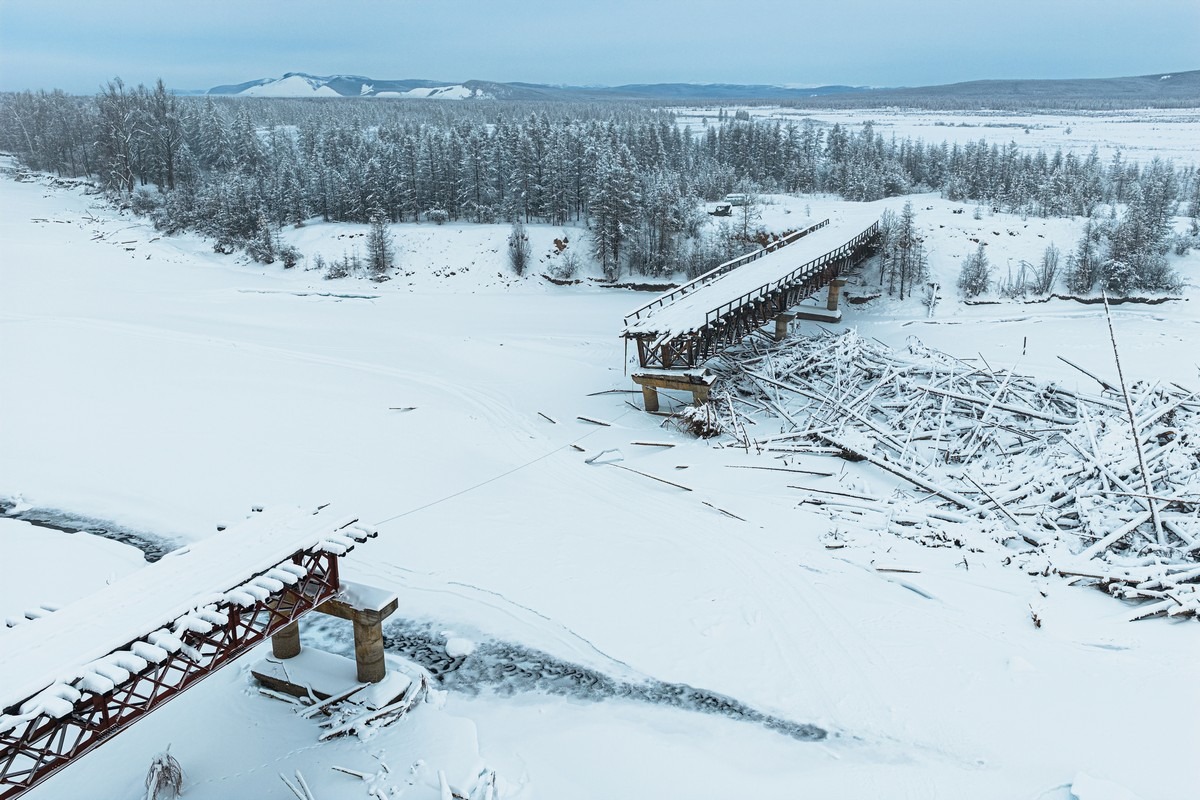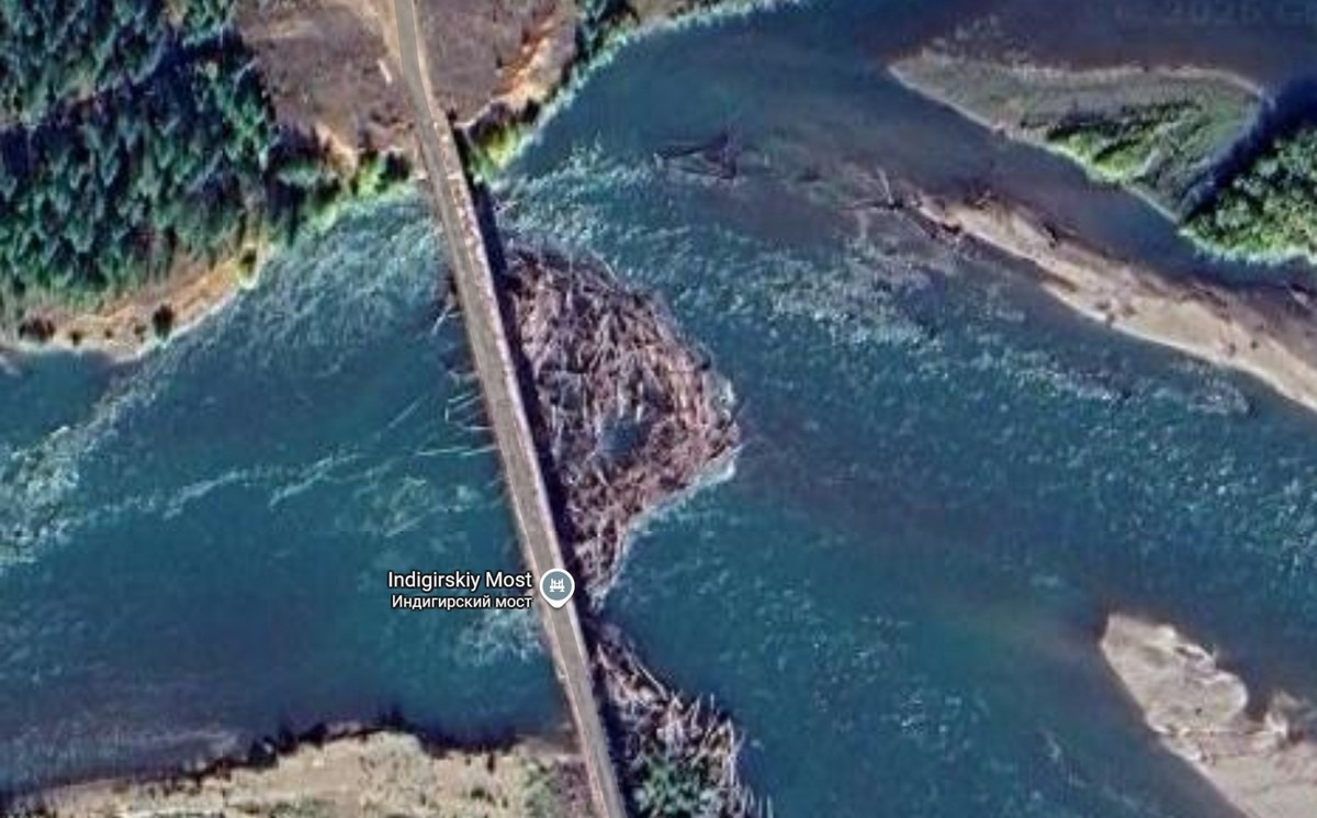 И нам пока вроде бы неплохо, машинки едут, погода за бортом комфортная, топлива с запасом: хватит туда-сюда метнуться = всё норм вроде бы! Дорожка вьётся вдоль ландшафтов… чуть левее — чуть правее, вдоль уже не Индигирки, а какого-то из притоков. Вдруг — очередной уже сильно уставший мост, у которого, видимо, специально обрушили одну секцию — дабы не суицидничал никто. Но зимой этот мост можно объехать просто по льду: