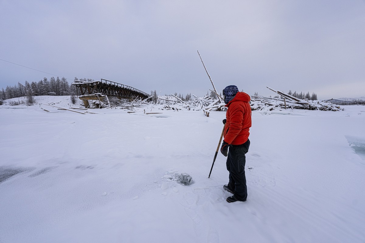 Что делать? Ехать по льду! Но даже в зимней Якутии речной лёд коварен, его снизу подтачивают вечно-немного-тёплые ключи, в результате здесь даже в адские морозы бывает открытая вода. Поэтому прежде всего наш командир и лидер достал специально приготовленную для таких случаев пешню и пошёл проверять лёд:
