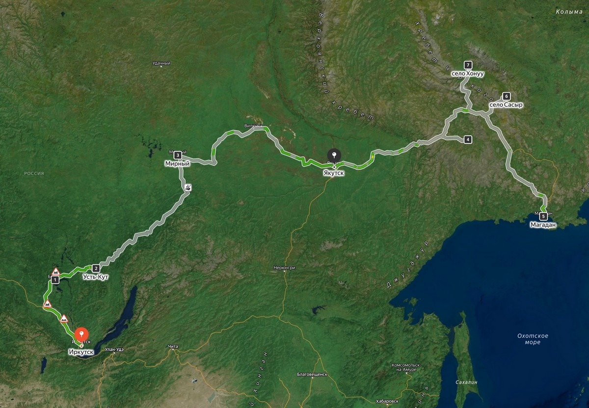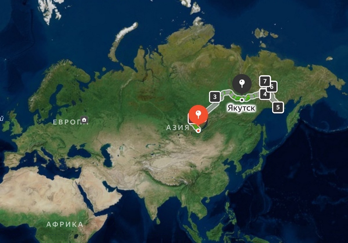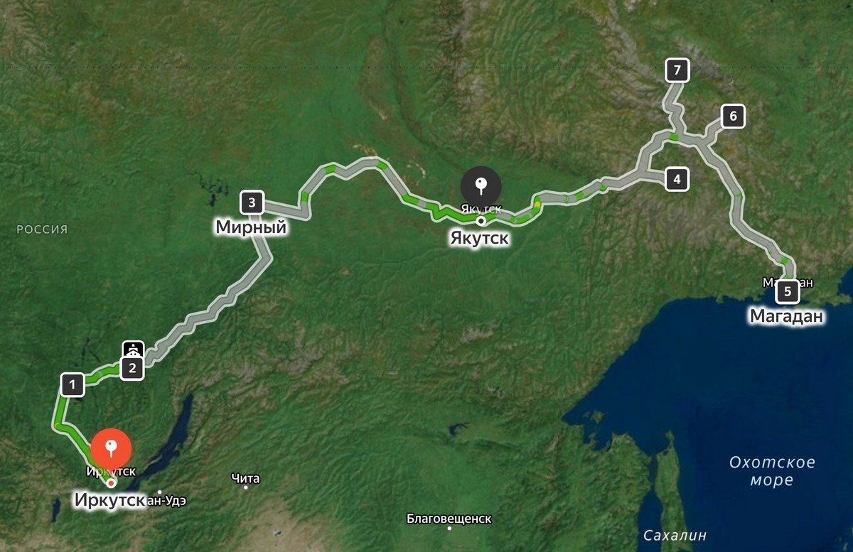 Есть небольшая неточность — западная часть дороги от Усть-Кута (под номером «2») до Мирного идёт по другому зимнику, который сейчас яндокарты отказываются прорисовывать. Но направление — всё равно верное.