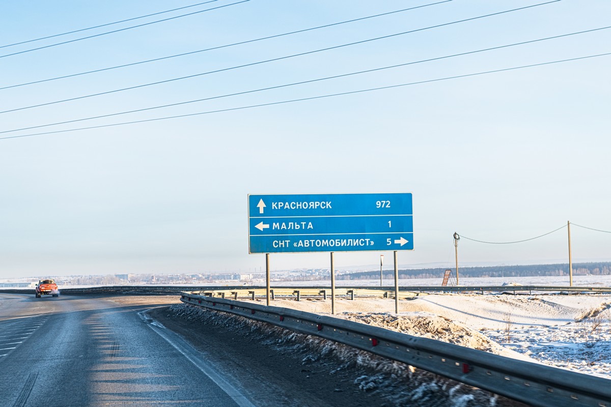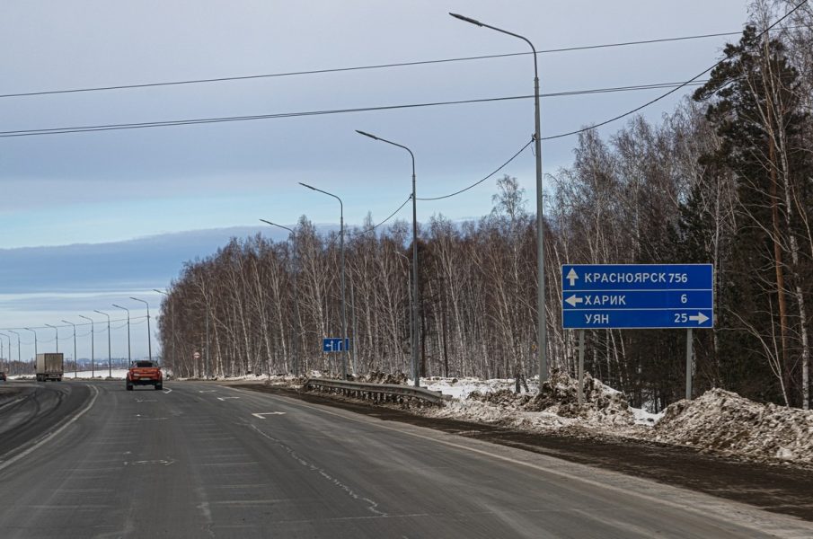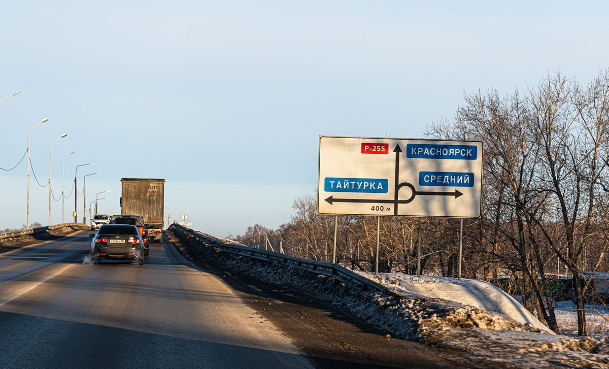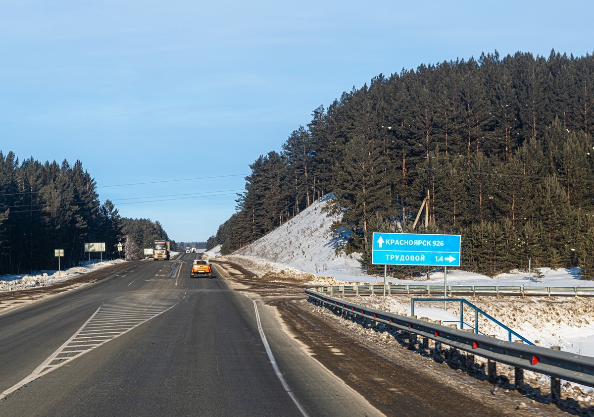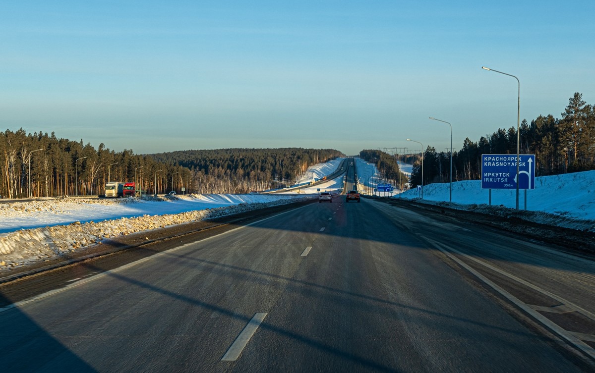 Примерно 60 км хорошей четырёхполосной скоростной дороги в сторону Красноярска, но потом снова две полосы. Эх, по нашим бесконечным пространствам дороги ещё строить и строить…