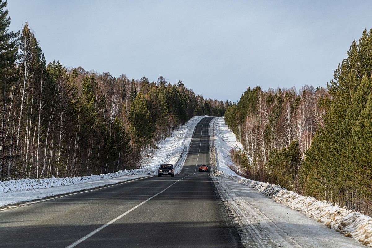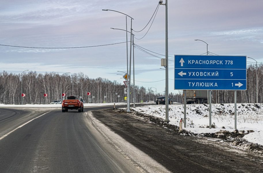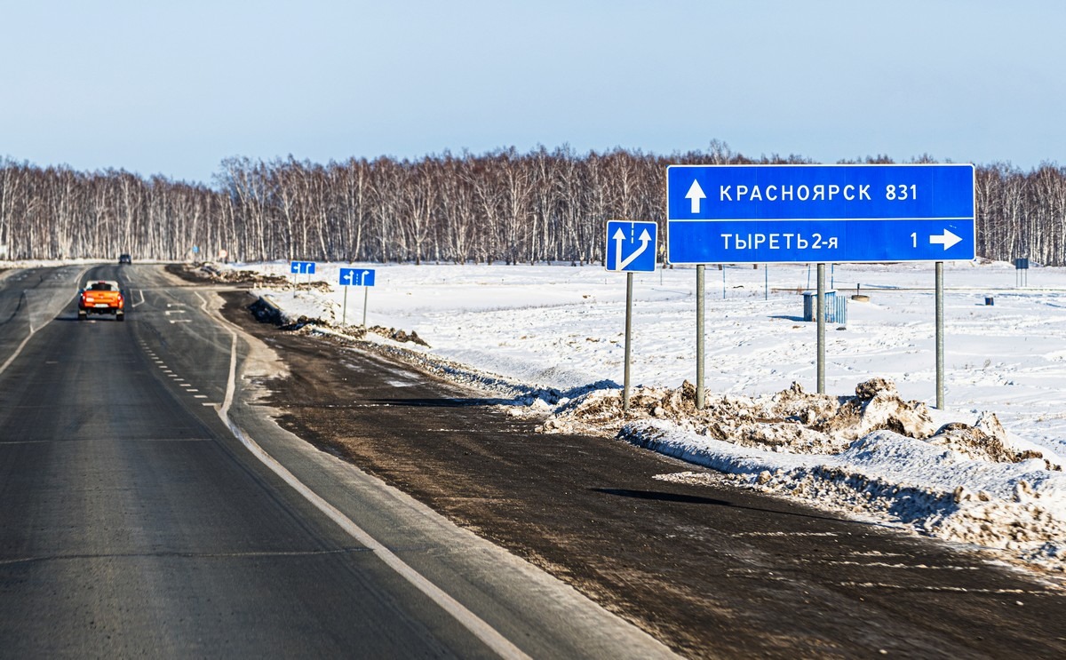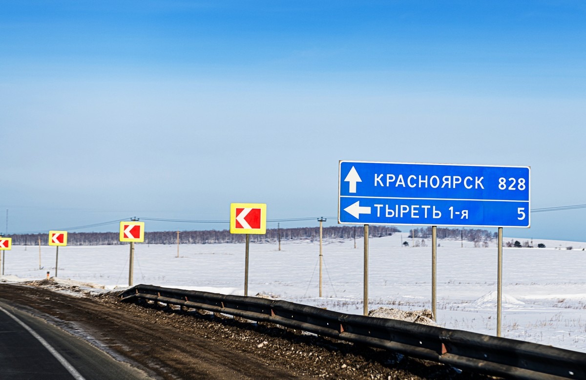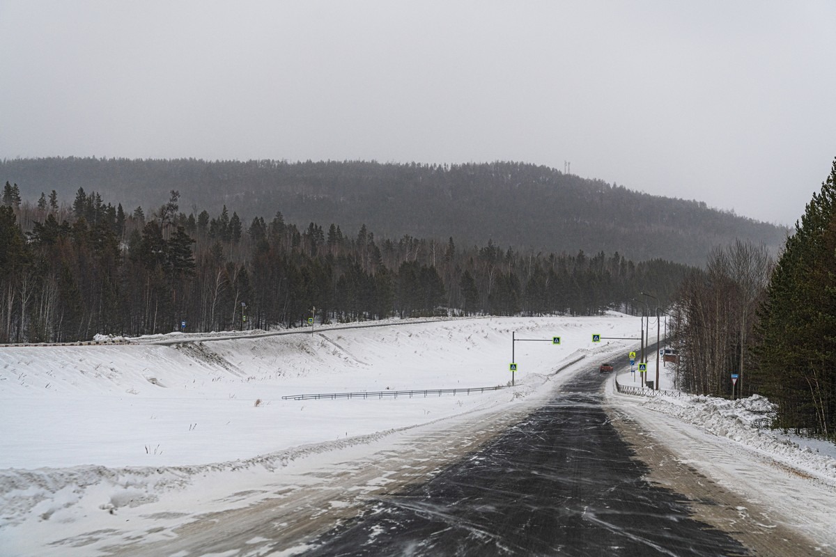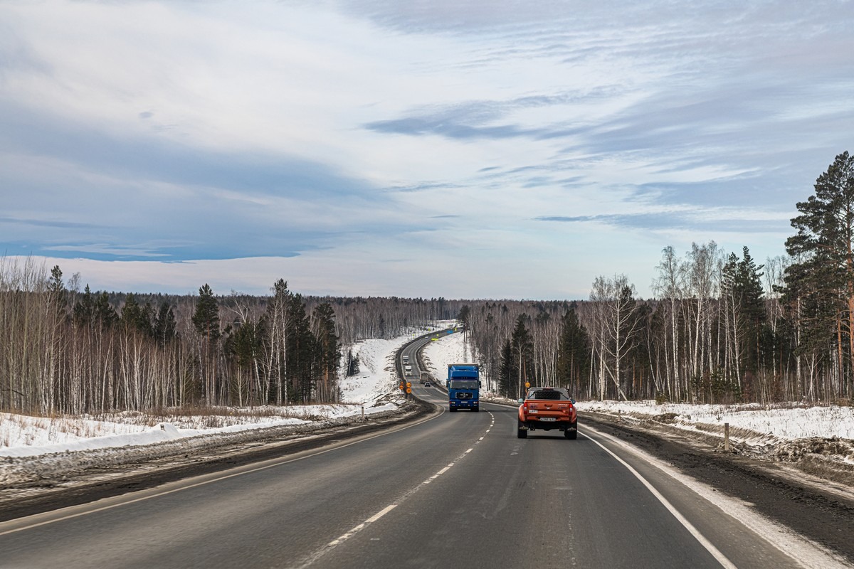 Примерно 60 км хорошей четырёхполосной скоростной дороги в сторону Красноярска, но потом снова две полосы. Эх, по нашим бесконечным пространствам дороги ещё строить и строить…