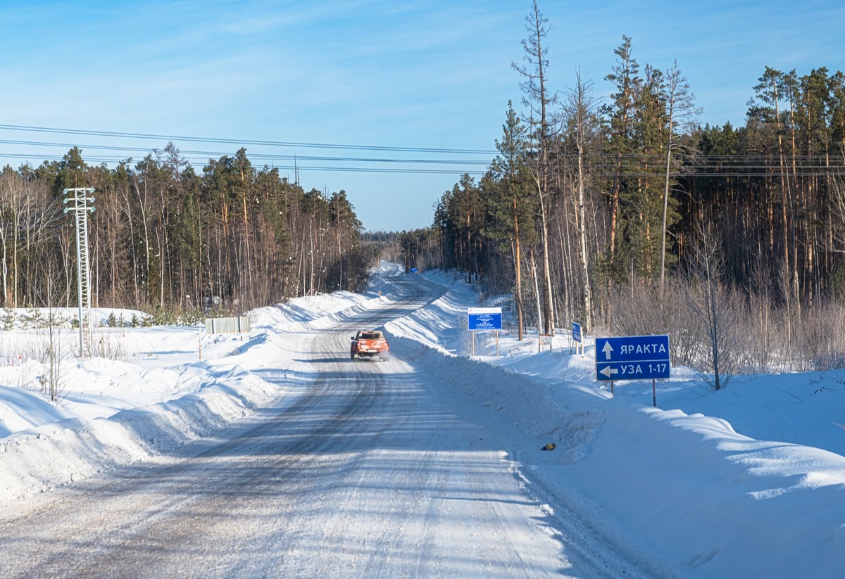 Мы за ним и не собирались! Нам — по автодороге, пусть даже и по зимнику, но по дороге. И сначала километров 150 от Усть-Кута идёт вполне приличная круглогодичная трасса. Щебёнка, не асфальт, но ровненько, почищено, знаки где надо стоят. Всё таки дорожные службы работают нормально!
