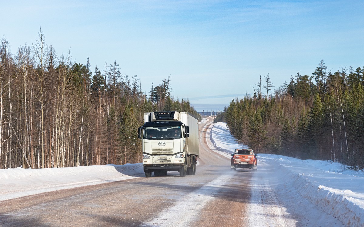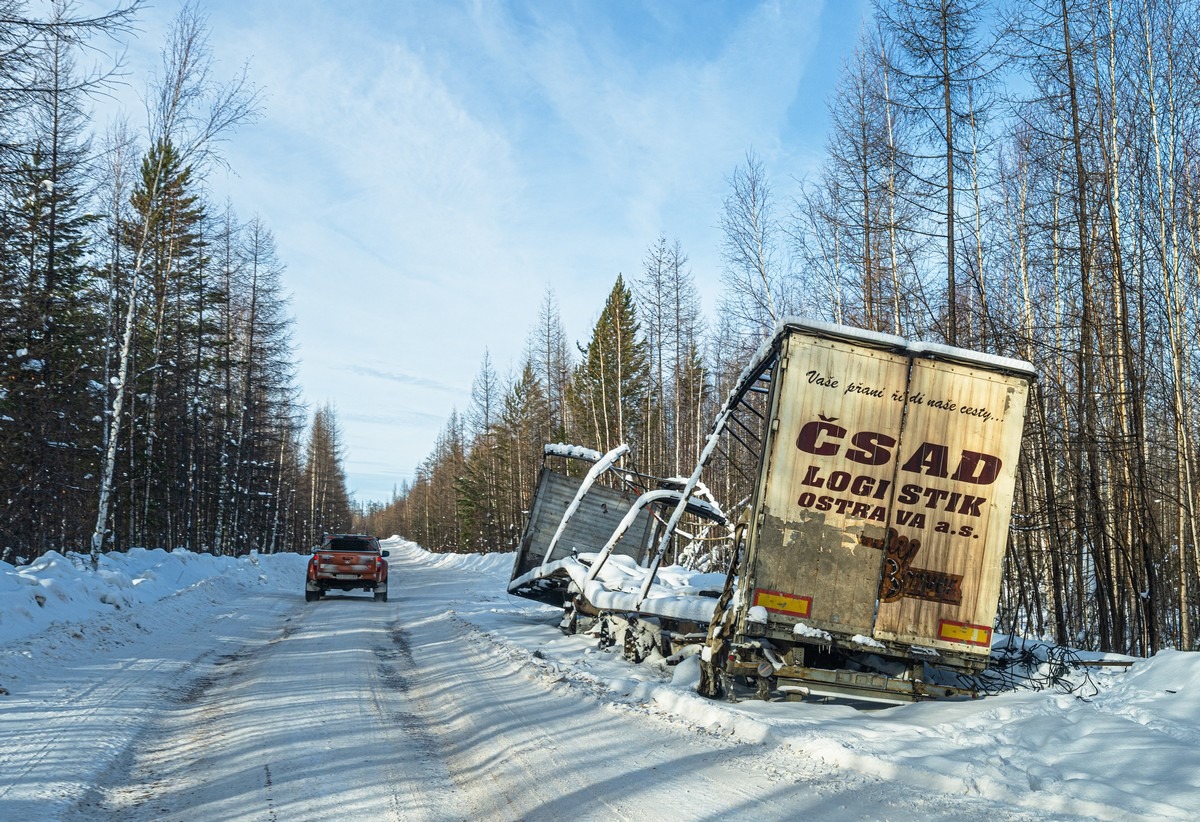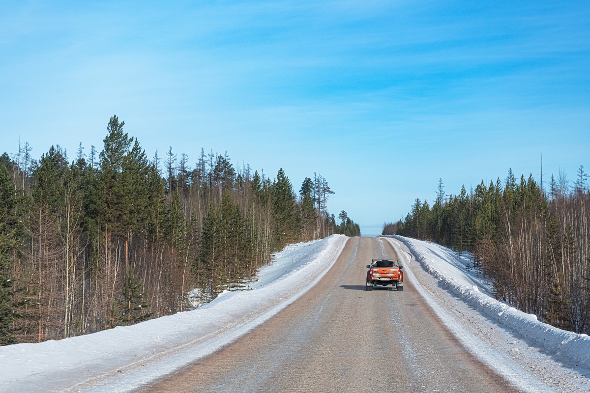 Уже рассказывал, но повторюсь, что трафик здесь бывает разной плотности в зависимости от экономической активности региона. Если строится что-то объёмное, то груза будет больше, а колея глубже. Если нет, то можно час-два ехать и никого не встретить. А потом вдруг караванами встречки и попутки идут. При этом ещё важно, куда едет грузовой транстпорт. Если на север, то он загружен по полной, тяжёлый и неповоротливый. Если же на юг, то пустой, лёгкий и весёлый :)