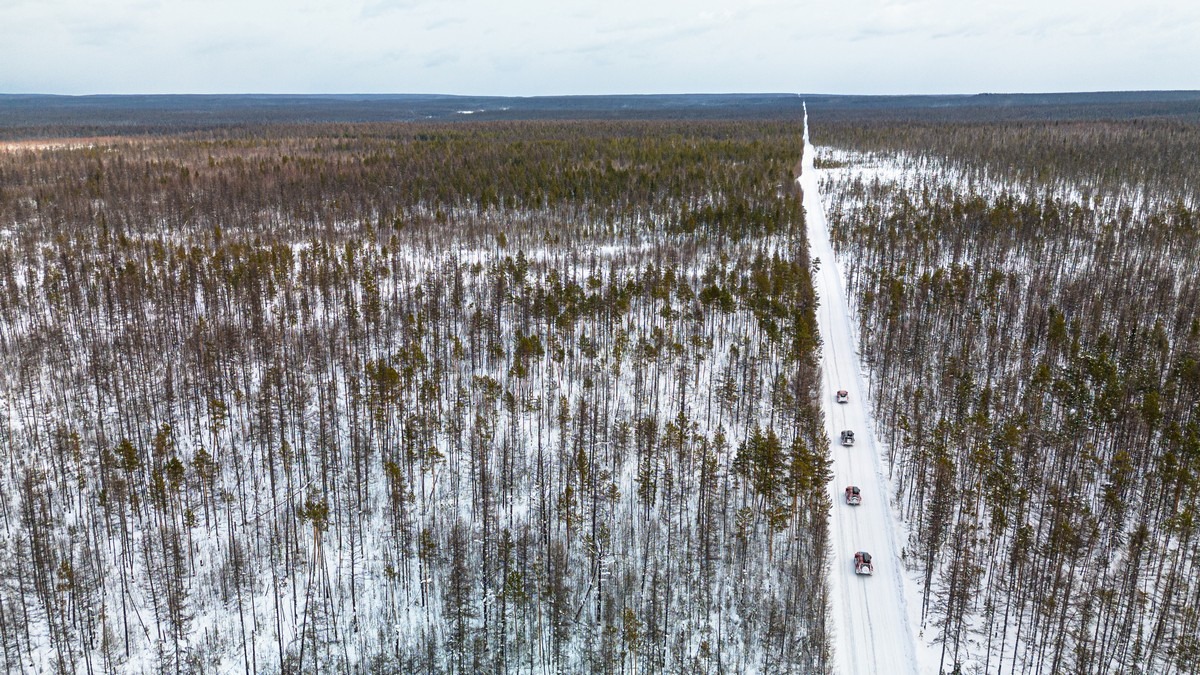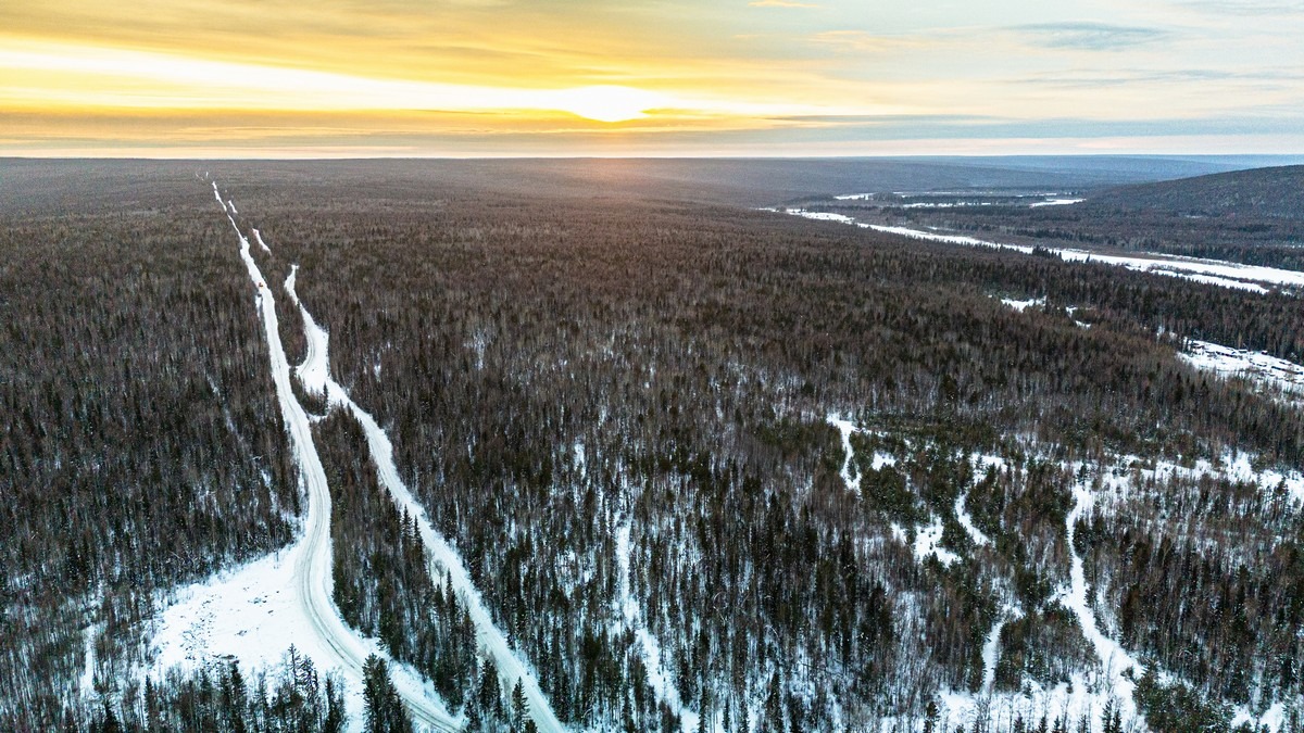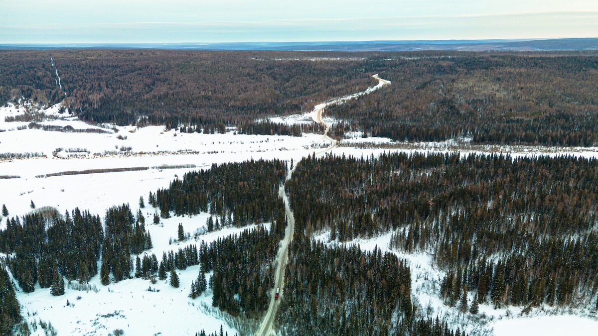 Заодно можно дроном полетать, посмотреть на зимник сверху. Вот он в одну сторону по практически абсолютно прямой просеке идёт: