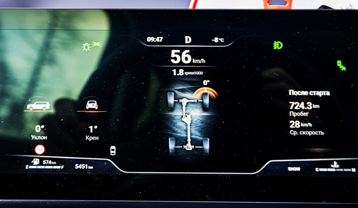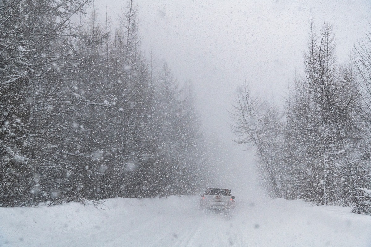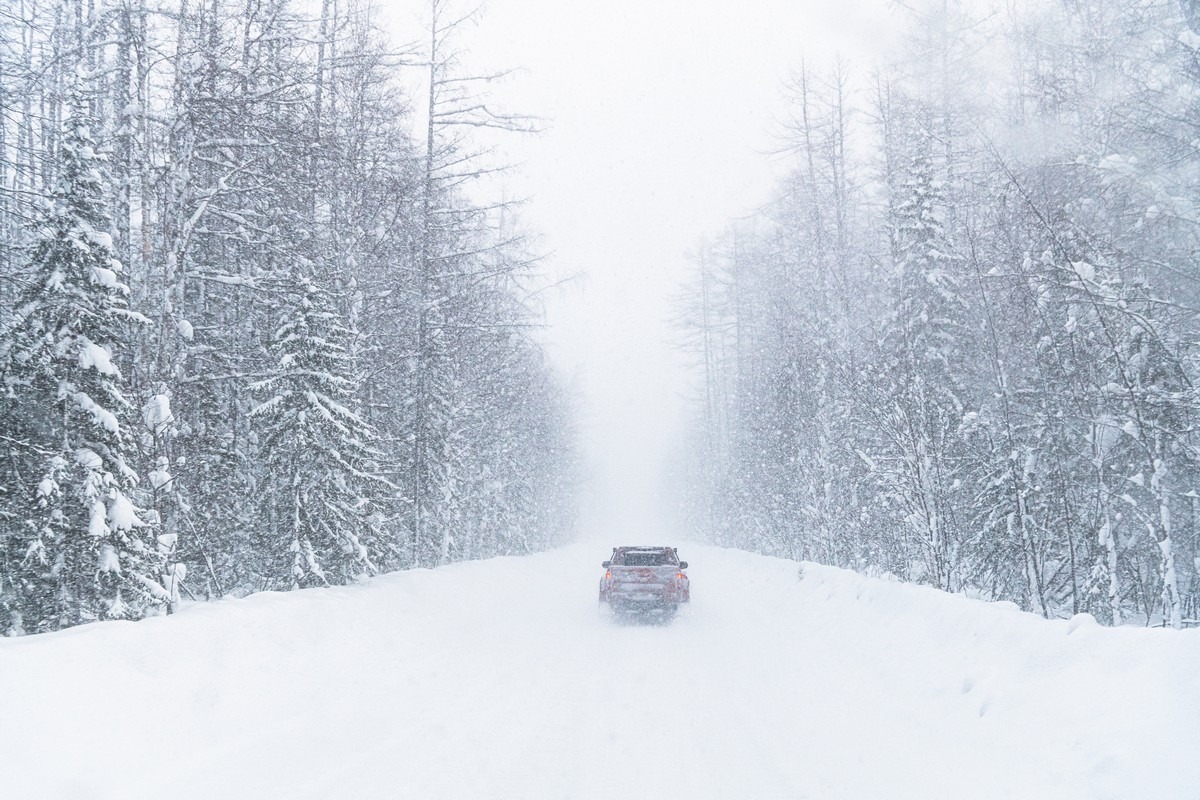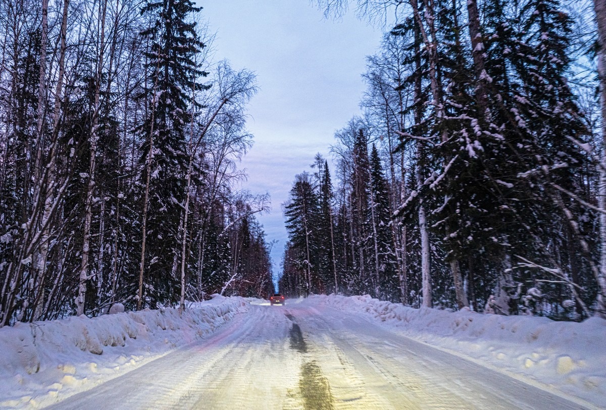 Всё, мы вышли на круглогодичную и регулярно обслуживаемую трассу. Но легче не стало — опять пошли снежные шквалы. Если ехать следом за другой машиной — вообще ничего не видно. Если подвинуться на встречку, то там комфортнее :) Благо, встречного (да и попутного) транспорта почти нет.