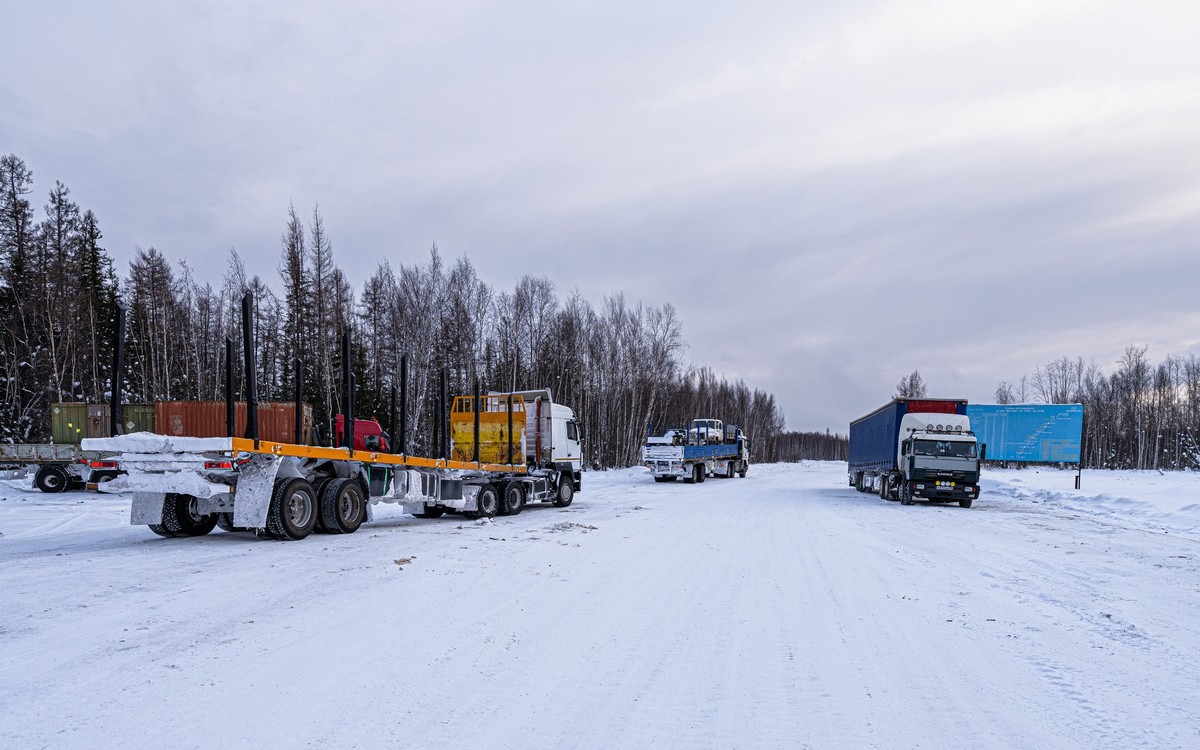 Фуры стоят на парковке: кто-то уже выехал с зимника, кому-то туда только выходить.