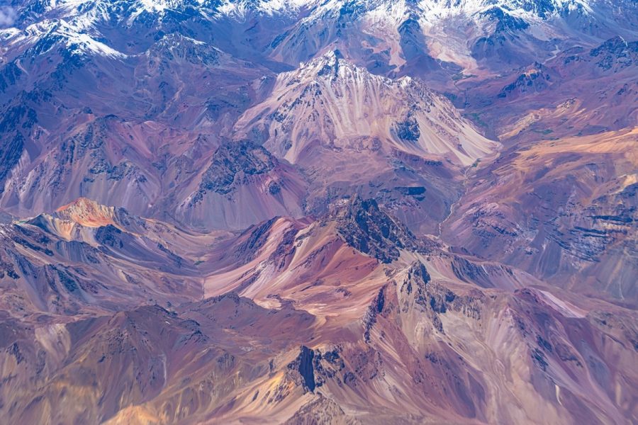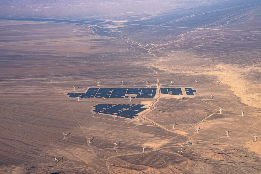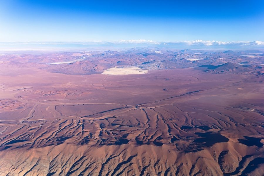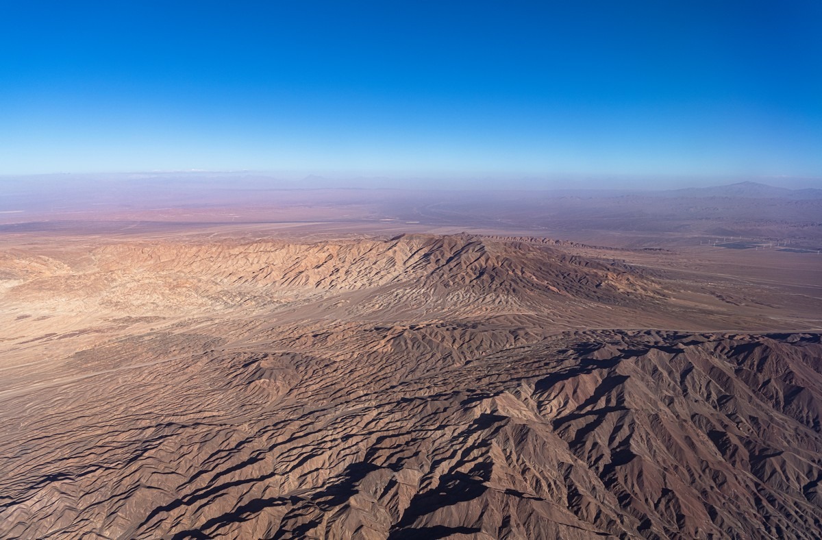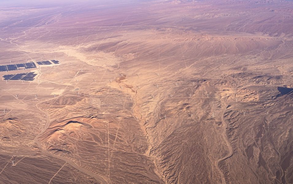 Безжизненно, горно, сверху синее, снизу коричневое. Если присмотреться, то видно разное промышленное — поля ветряков и солнечных панелей: