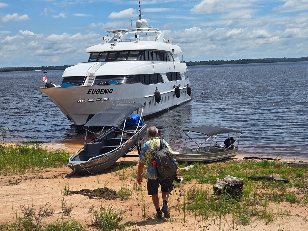 Всё на этом. Долетели норм! А кораблик, который ждал нас в Манаусе на берегу речки — вот он. Белый, на заднем плане который: