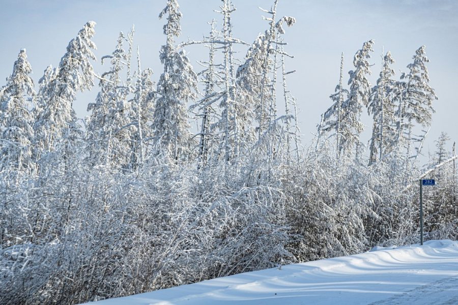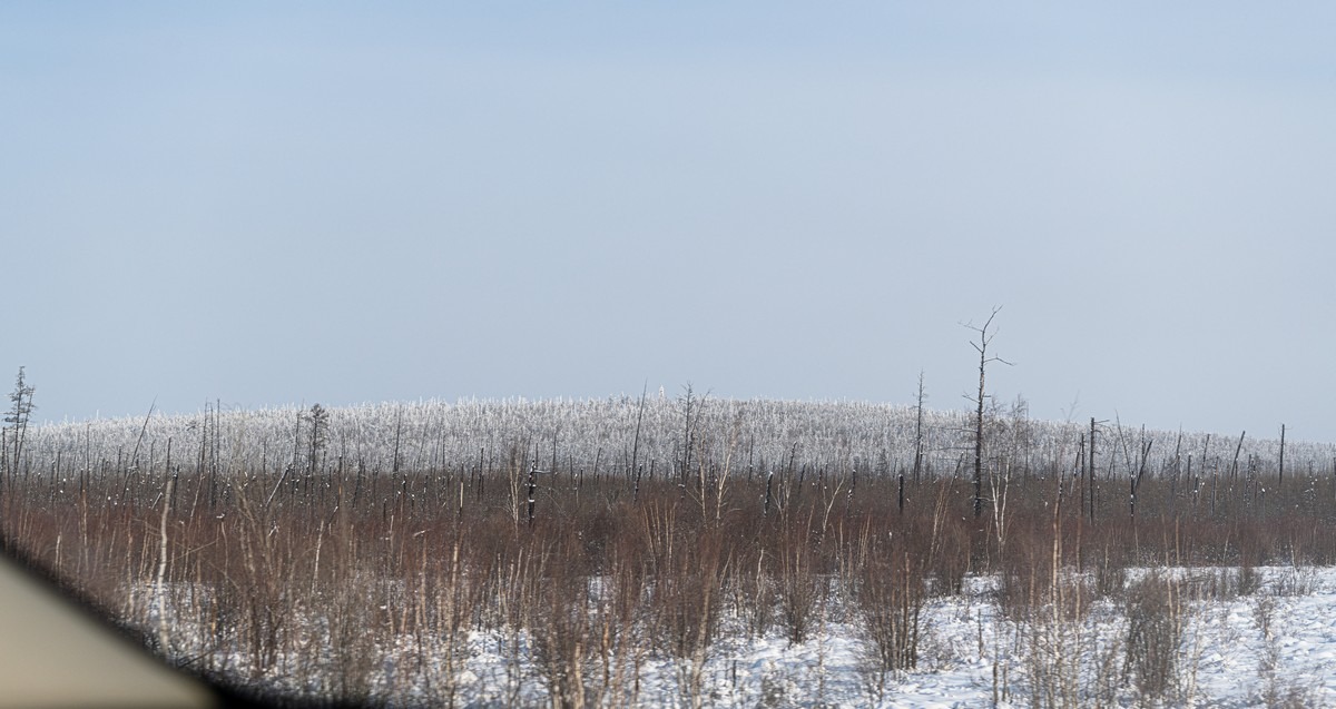 Почему это случилось именно в этом месте — непонятно. Но забавно: кусты и деревца около трассы без снега и инея, серые. А чуть вдалеке холм — весь белого цвета.