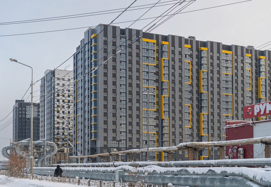 Новостройки многоэтажные — научились всё же строить вот такие сооружения на вечной мерзлоте! Но трубы всё равно над землёй..