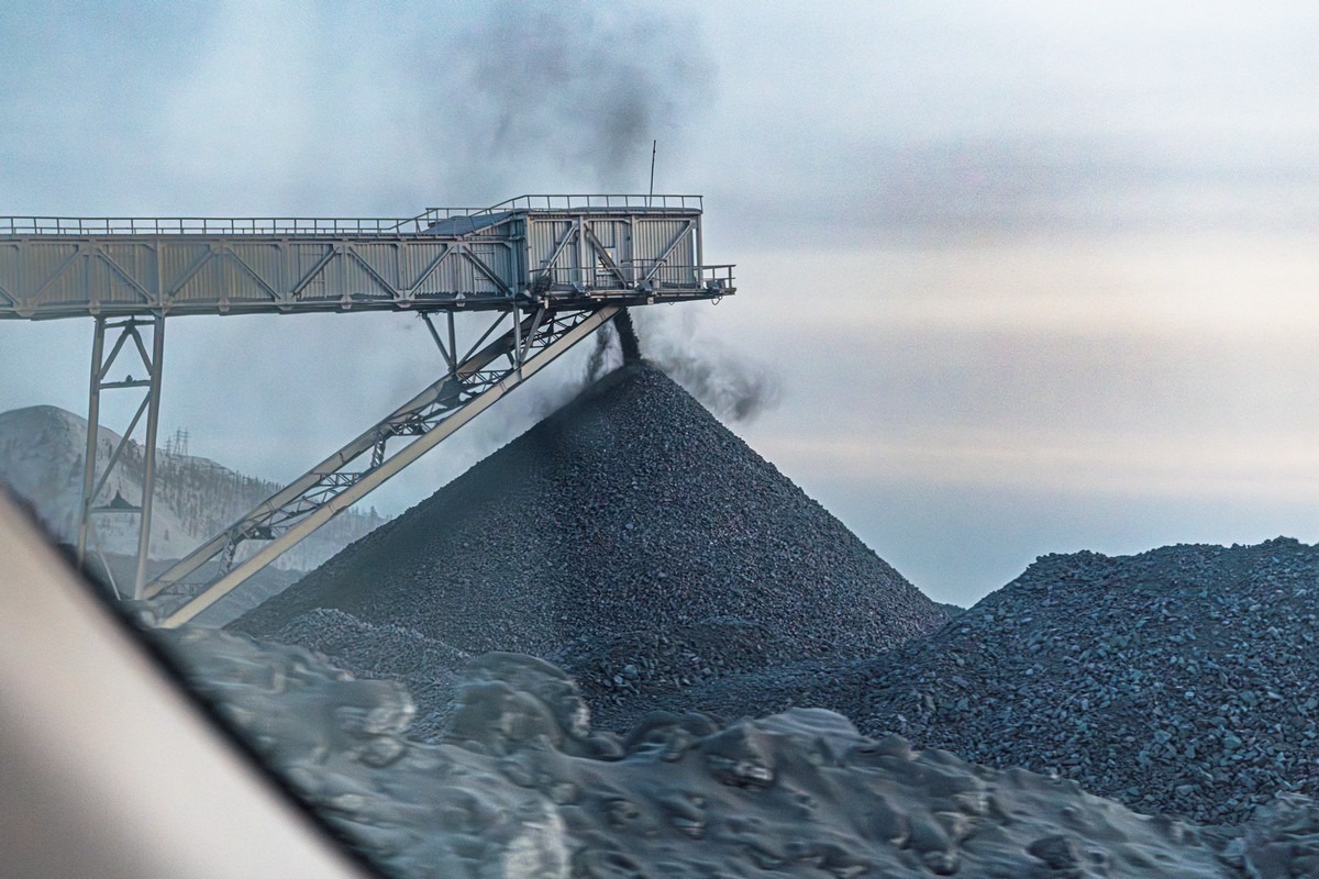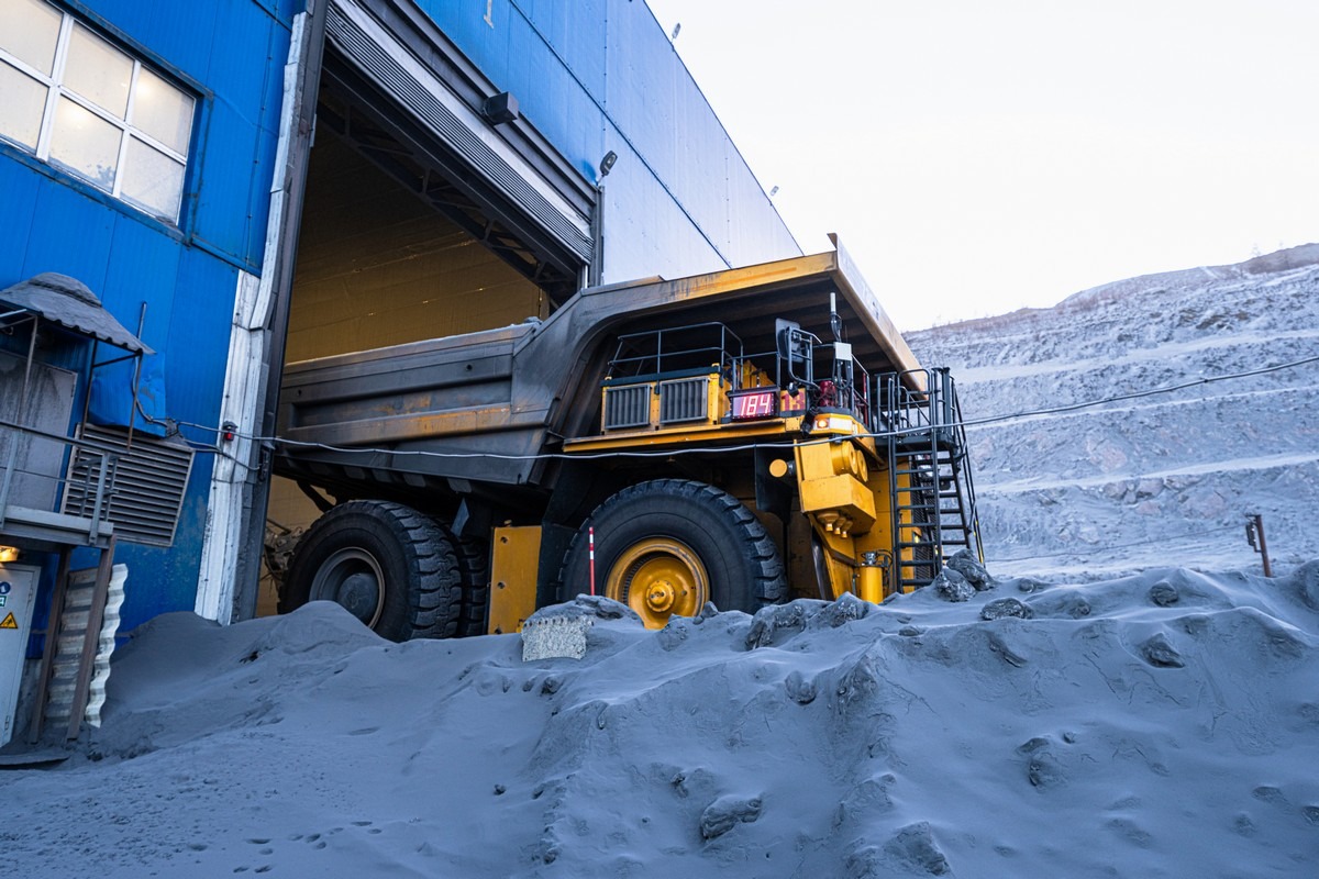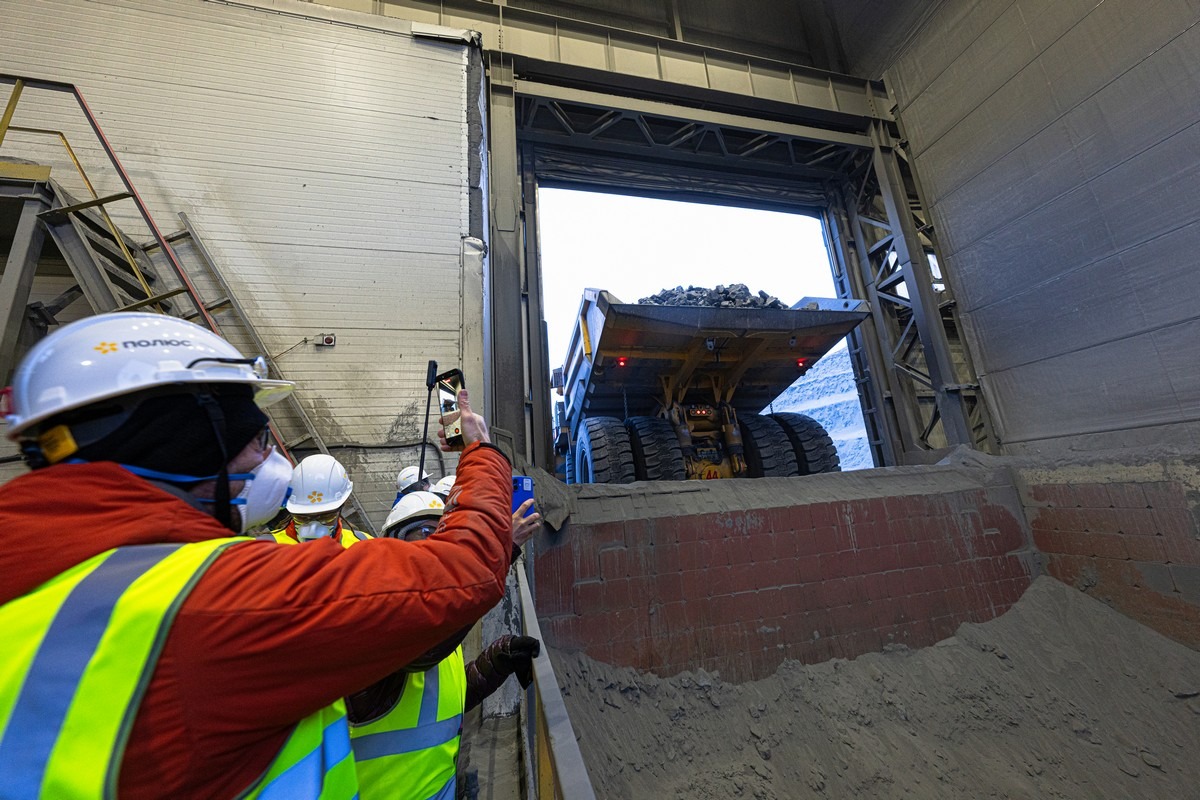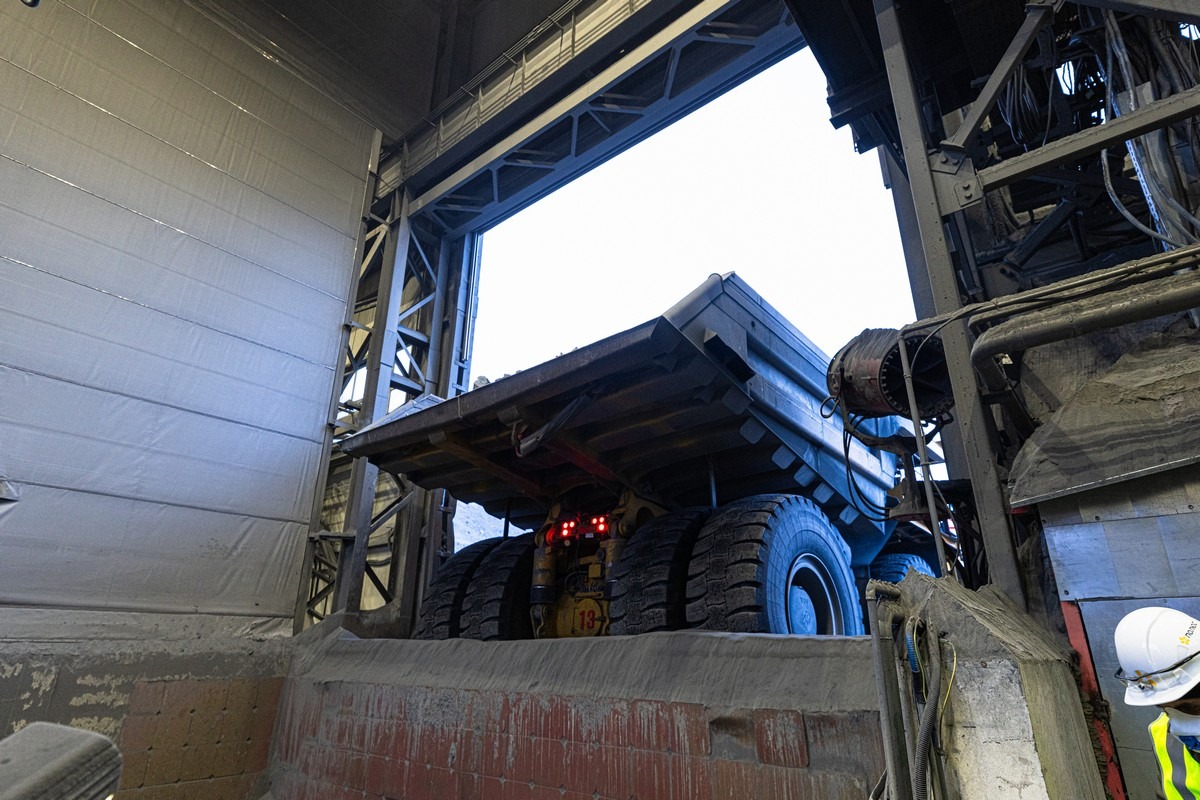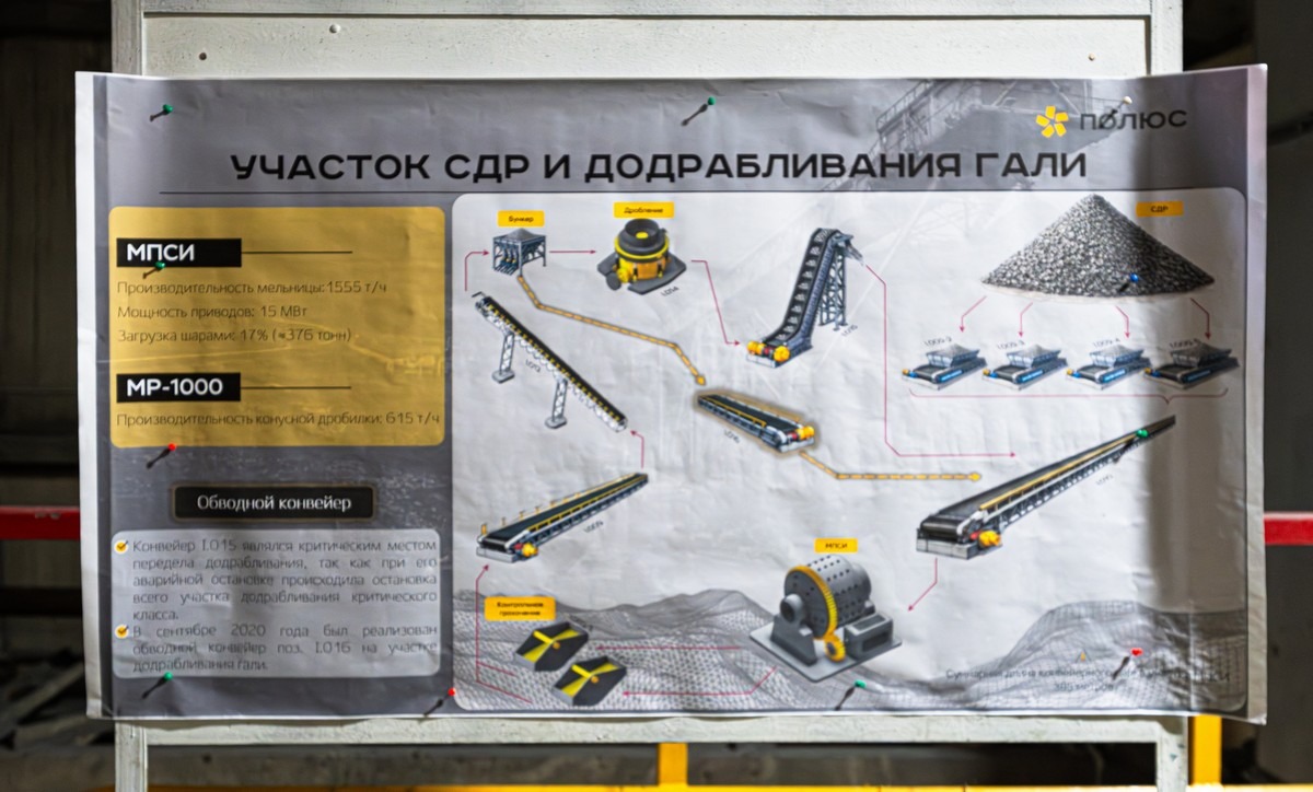 Раздробленную породу по ленте транспортёра (сквозь туннель в рядом установленной сопке) передают в цеха обогащения: