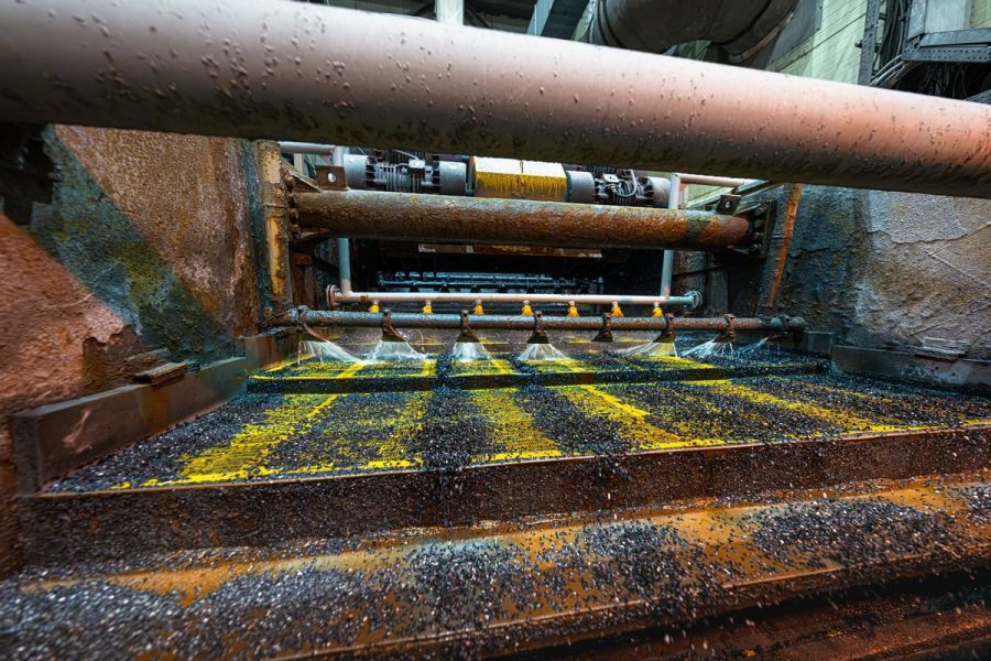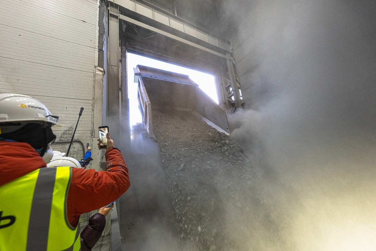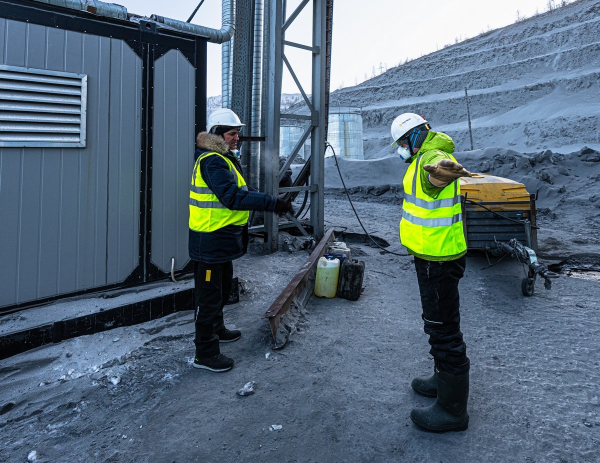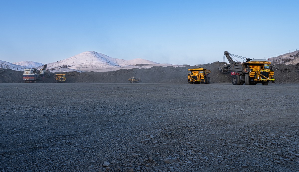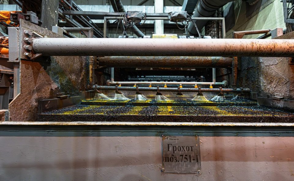 Раздробленную породу по ленте транспортёра (сквозь туннель в рядом установленной сопке) передают в цеха обогащения: