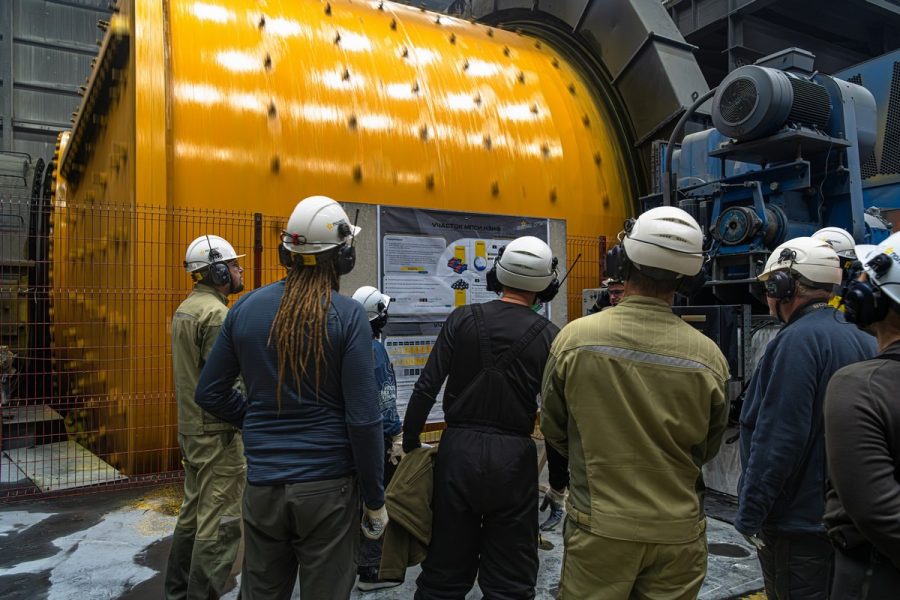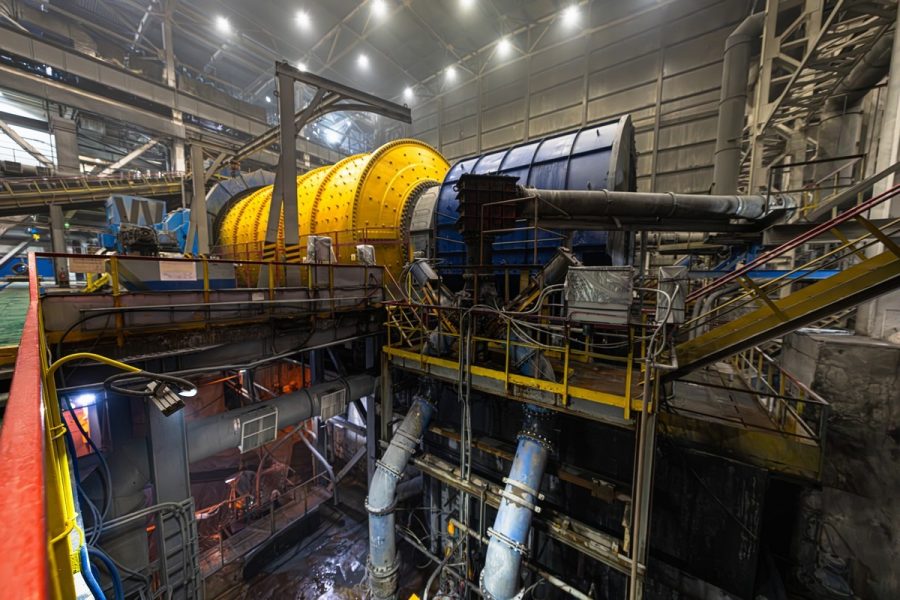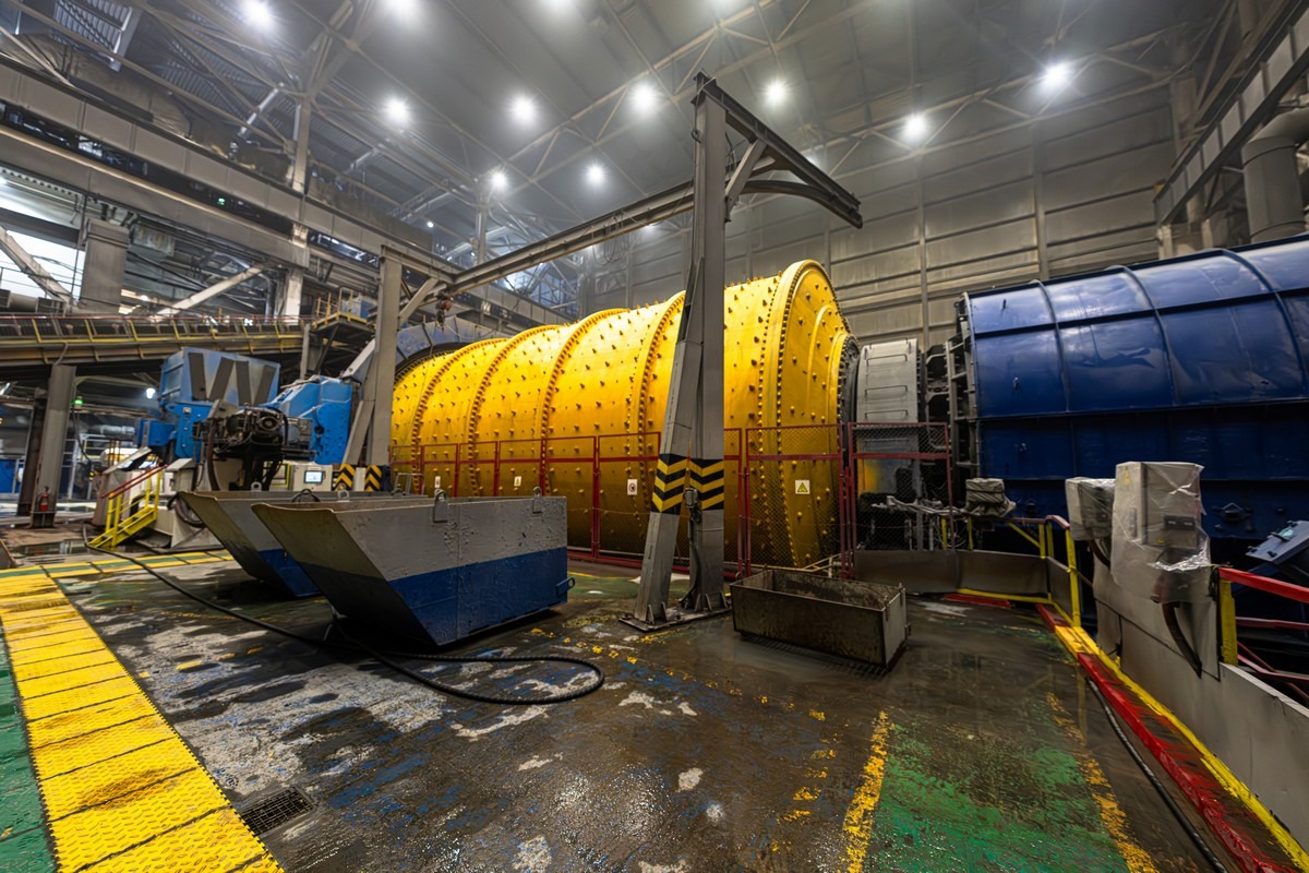На первой «дробилке» добытой породы её дальнейшее размельчение не заканчивается. Дальше идут вот такие вращающиеся барабаны, где внутри металлическими шариками все должно перемолоться в полную труху: