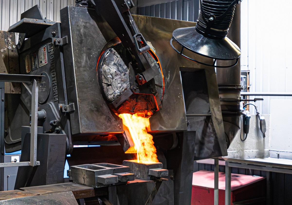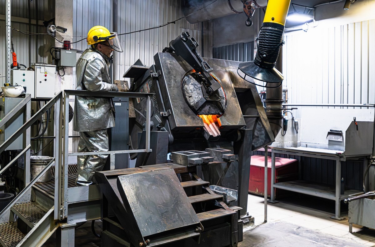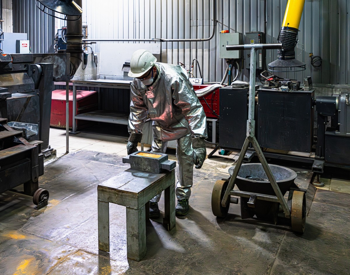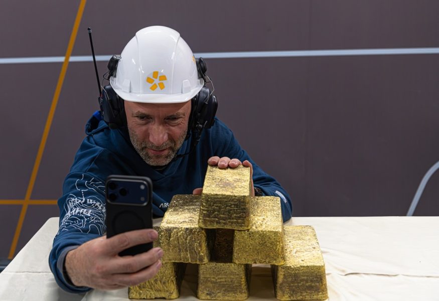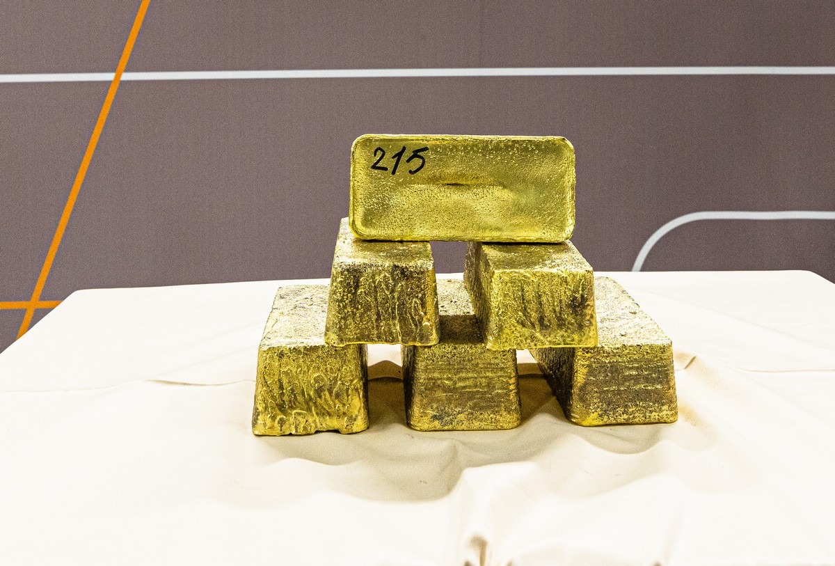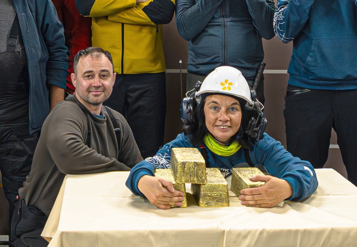 А вот это — готовая продукция. Примерно на 75% золото, ещё 20+% серебра, плюс прочее лишнее. Брусочки эти примерно по 12 кг — и отсюда это отправляется на более тщательную обработку, чтобы получить практически чистое (999 пробы) золото и такое же примерно серебро.