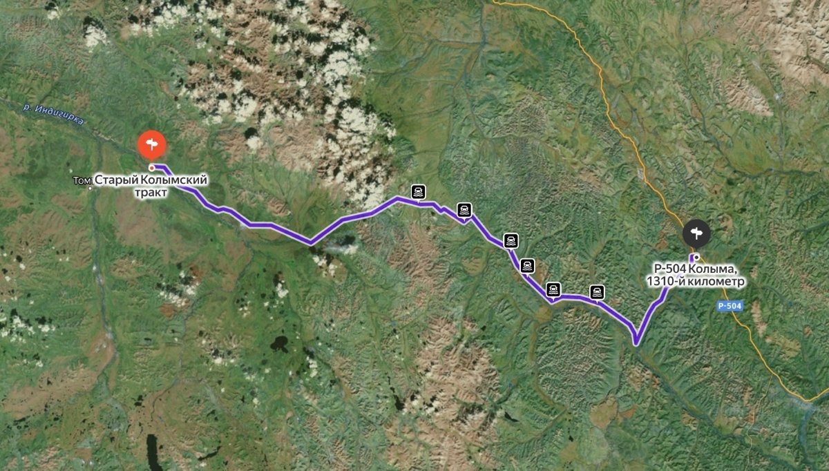 В этом сезоне навалило какое-то аномально непредсказуемое количество снега, и об этом нам сразу сказали давно знакомые местные жители. Но поскольку у нас всё давно спланировано, сбюджетировано, оплачено и подготовлено – то решили идти Старую Колымскую дорогу. От крайней западной точки – Томтора (верней, от старого и уже разрушенного моста через Индигирку, который в 23 км от Томтора) – и до куда получится добраться, в идеале – до восточной части автодороги «Колыма». Т.е., примерно вот так на яндокартах: